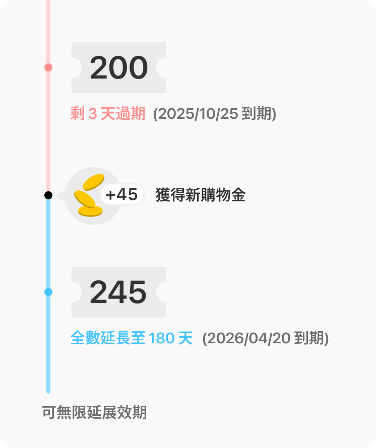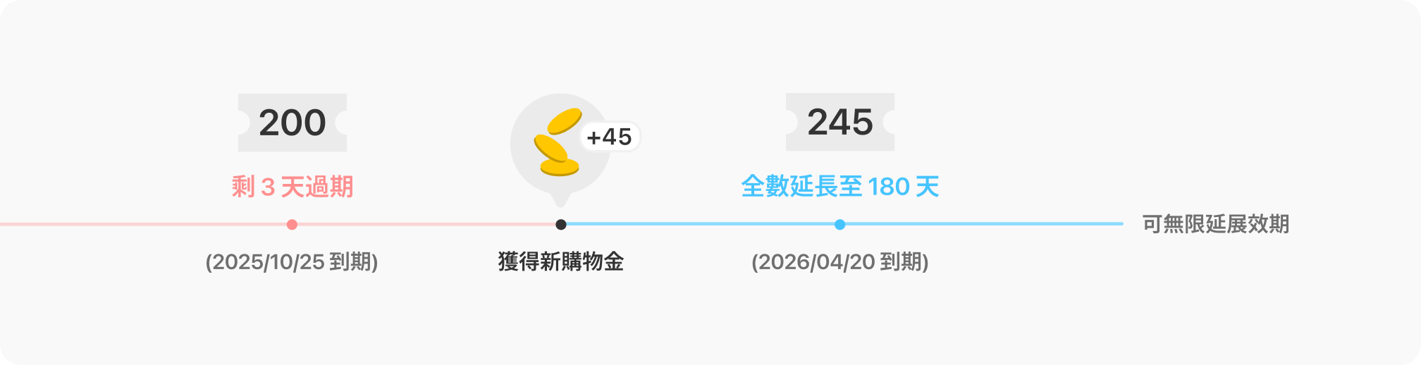 - 終身不過期機制(滾動展延): 只要您在效期內有「滿 $1,500 以上消費並獲得新的一般購物金」,您帳戶內所有一般購物金的效期將自動往後遞延,最多滿 180 天。只要持續回來消費,點數永遠不過期!