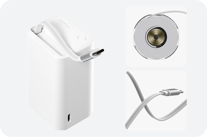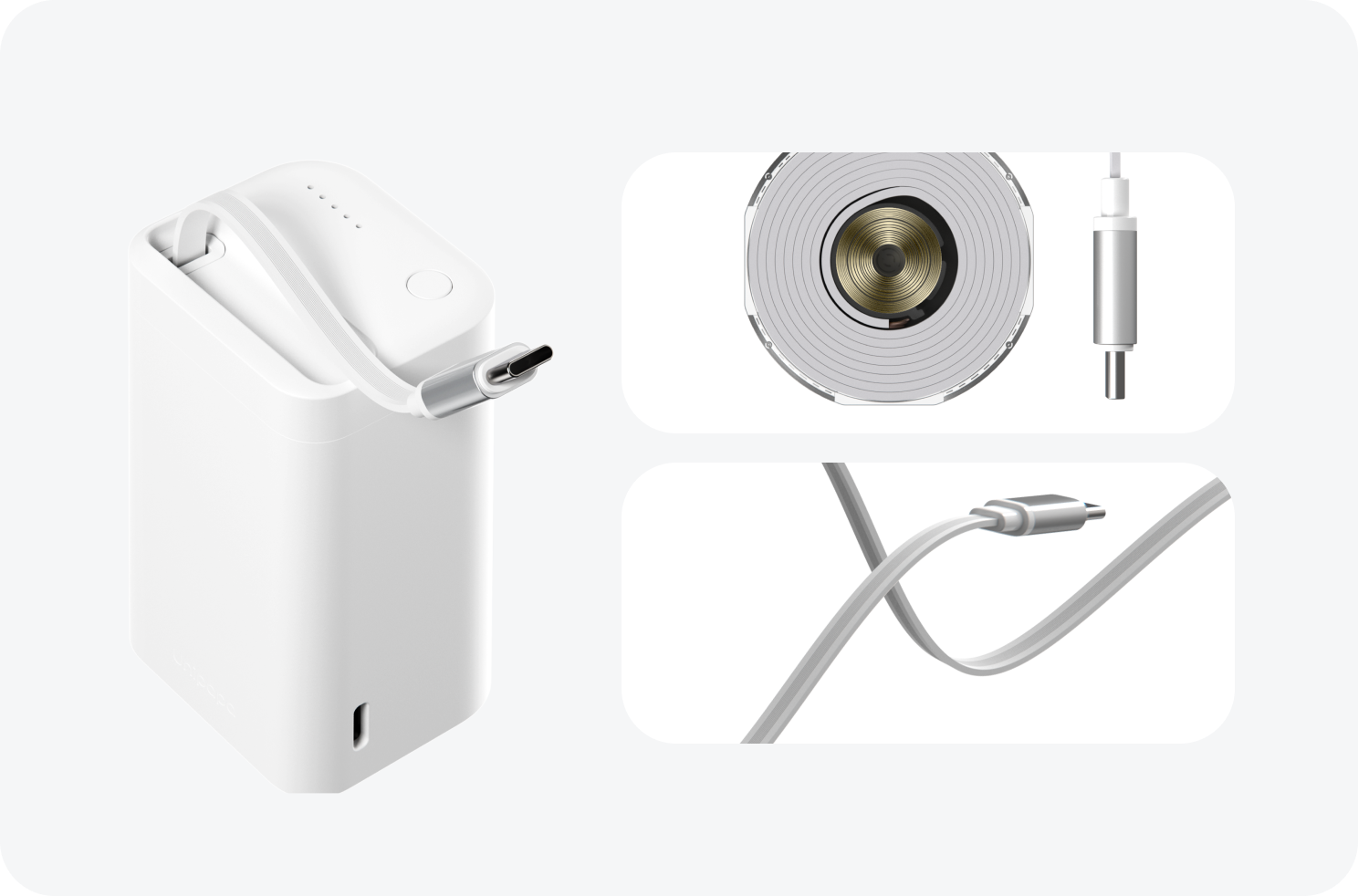 廣受好評的收線設計,現在行動電源上面也有了。幫你解決日常使用行動電源的困擾:不用帶線,一拉就充,充電過程超流暢。