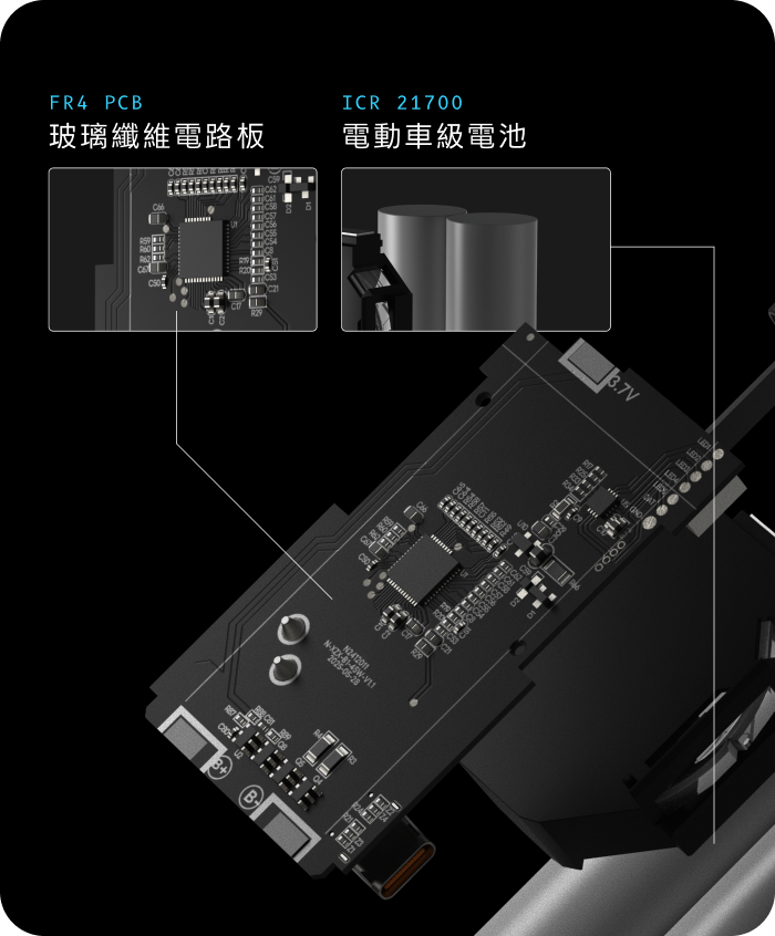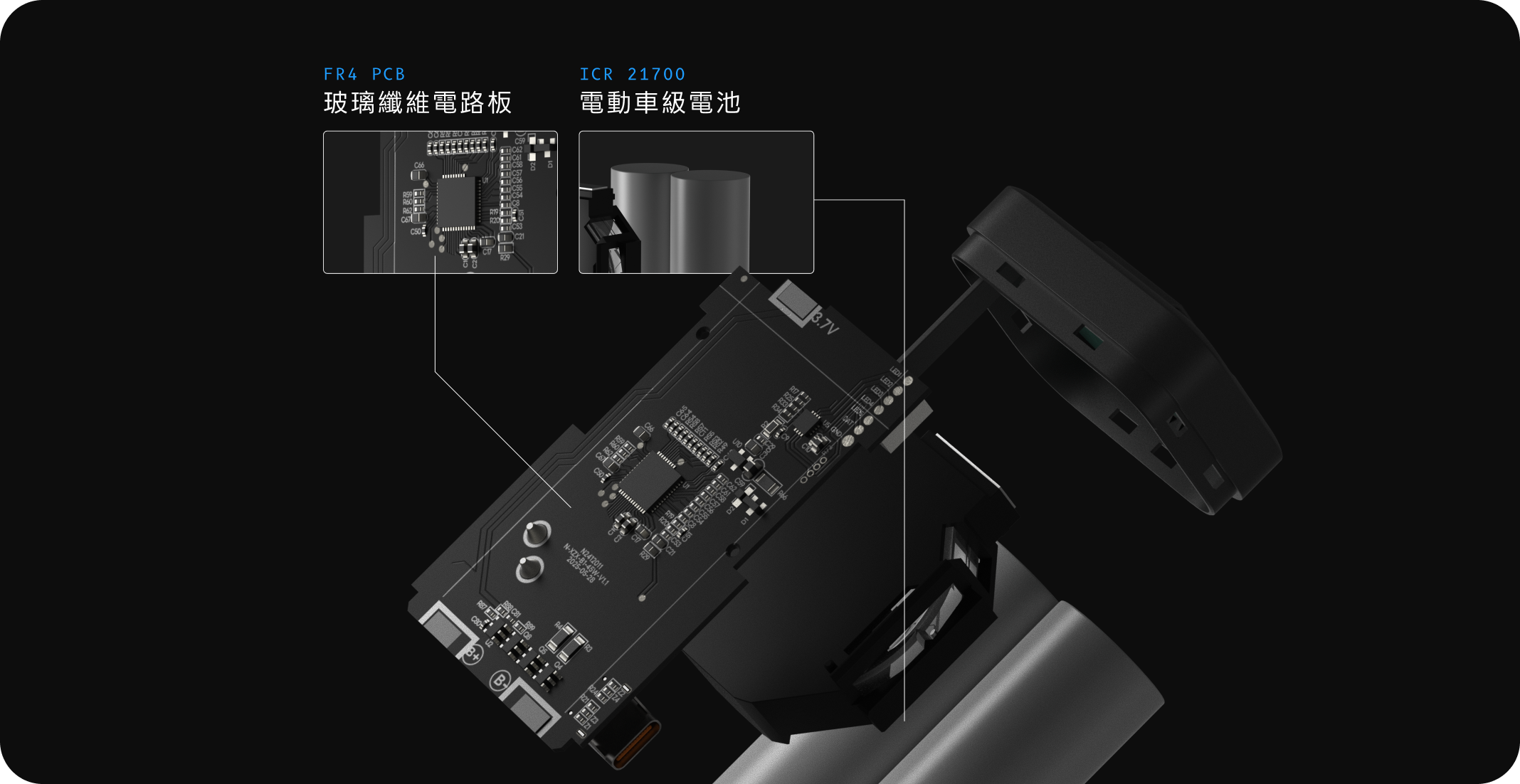 搭載 21700 電動車級柱狀電池,穩定輸出、壽命更長,整體結構以高精度 PCB 佈線與散熱銅層設計,確保長時間使用下仍能維持安全與效能。