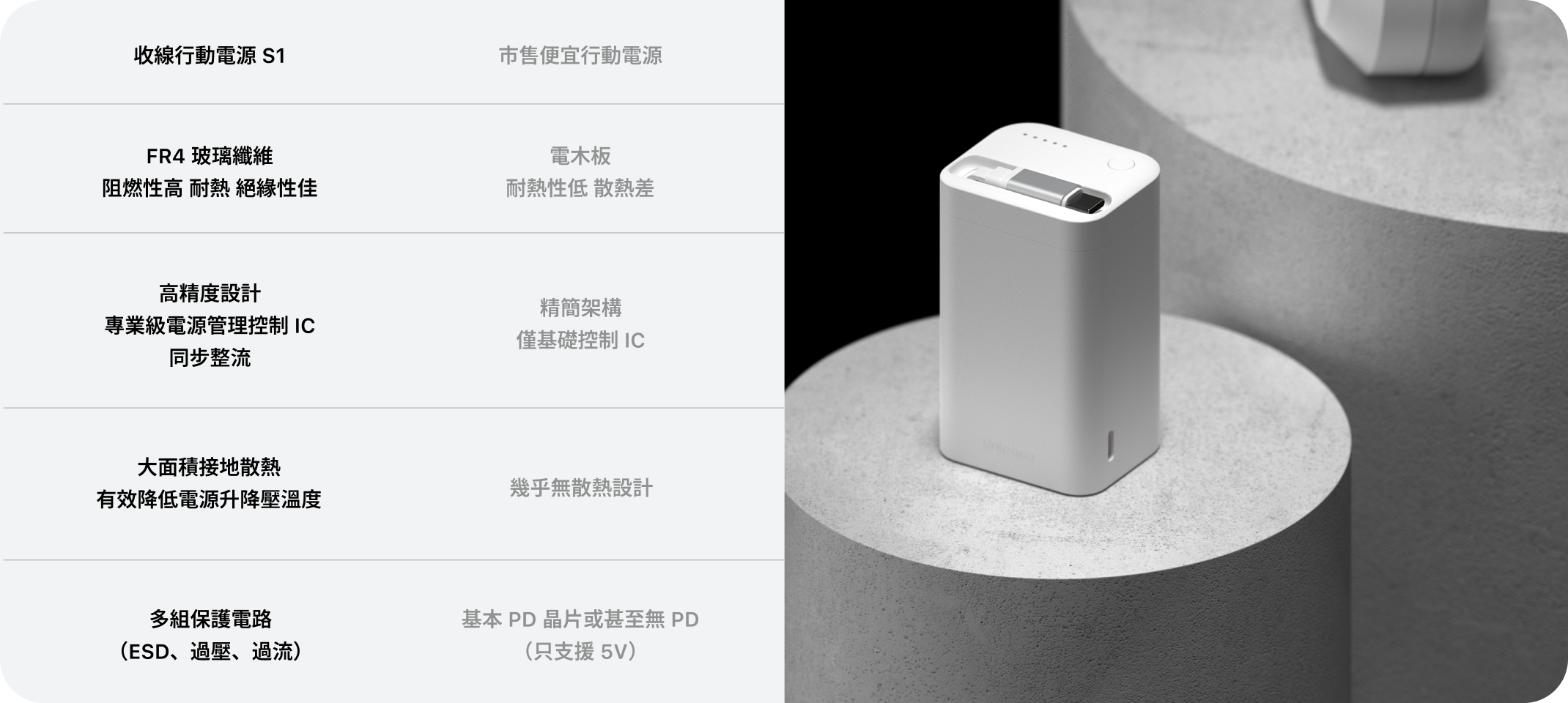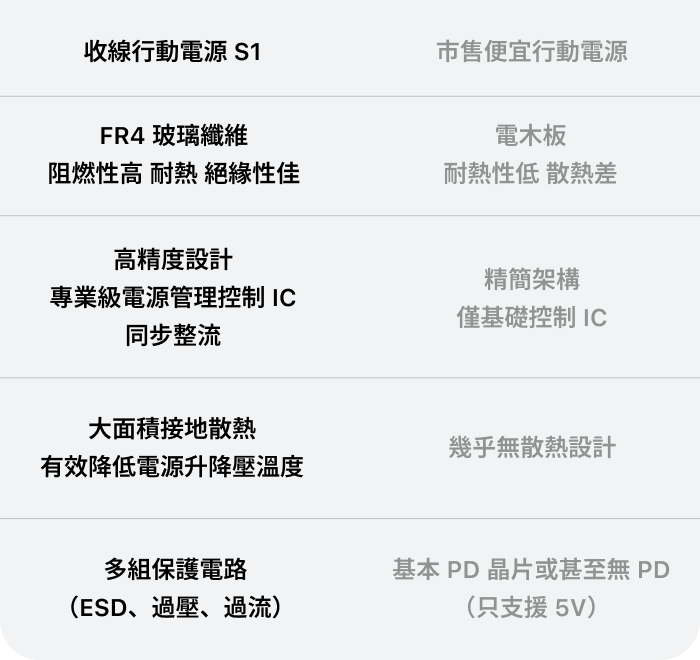 S1 採用玻璃纖維電路板,導熱與耐用性都優於一般電木板。內部高精度電路設計,搭配專業級控制 IC,同步整流以提升效率與穩定性。