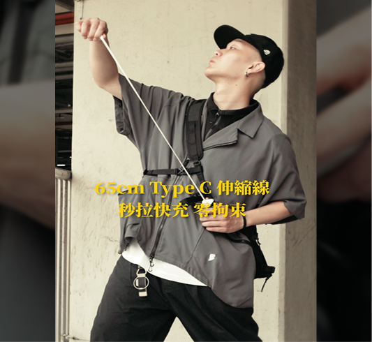 內建 65 公分伸縮線,採用多段固定結構,拉一下線材即可穩定伸展、平滑回收。65 公分長度給你剛好足夠的使用範圍,日常中用手機、傳訊息、拍照、導航等動作都自然不拉扯。